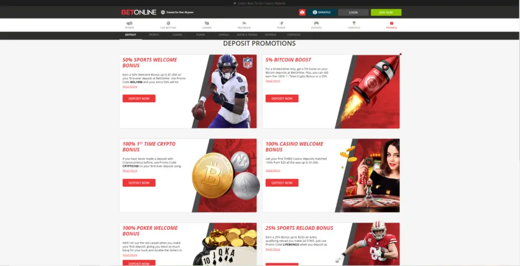 We have provided details on each of the current promotions offered at the BetOnline website. Since their bonuses change on a regular basis, we update this often.