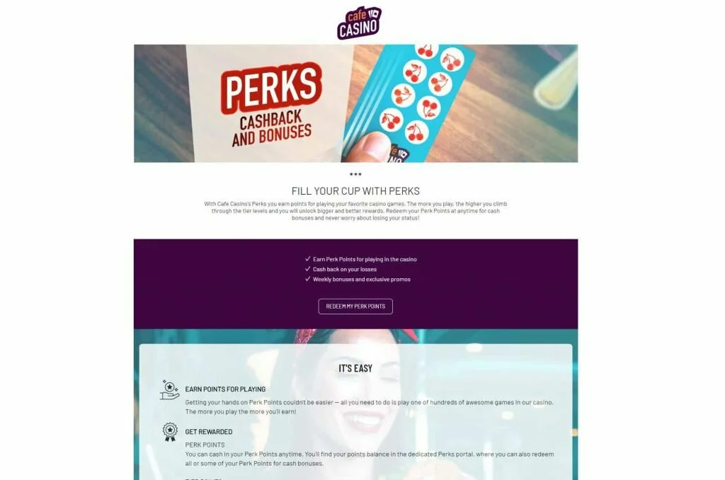 Perks is the name of Café Casino’s rewards program. All players start out with certain rewards by virtue of joining the Perks program. Entry-level members enjoy 10% Daily Cashback offers, weekly bonus offers, a chance to win a weekly $4,000 prize pool drawing, and the standard spate of bonuses and promotions offered above. As you accumulate more rewards points, those numbers start going up. For instance, at the next level (in exchange for 50,000 points) you have access to $150 referral fees, more entries in the prize pool, and even better bonus offers.