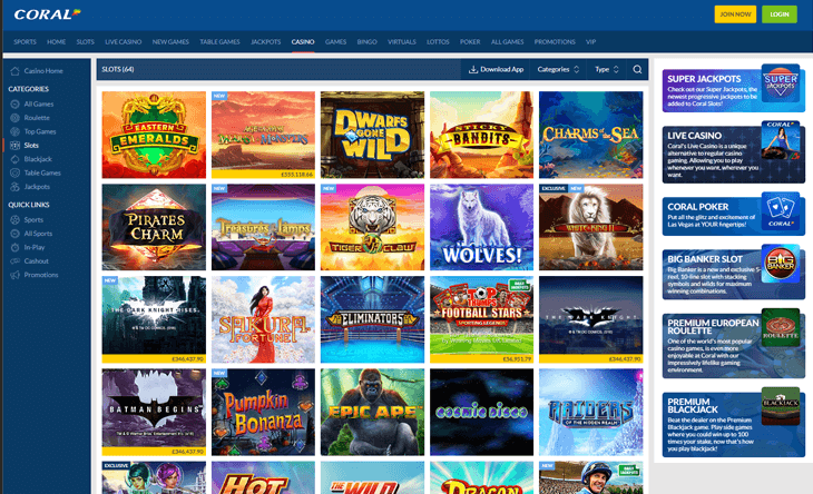 I was surprised to find just 103 titles in the slots category at Coral’s casino – I was sure this was shaping up to be another site aimed almost exclusively at slots fans.