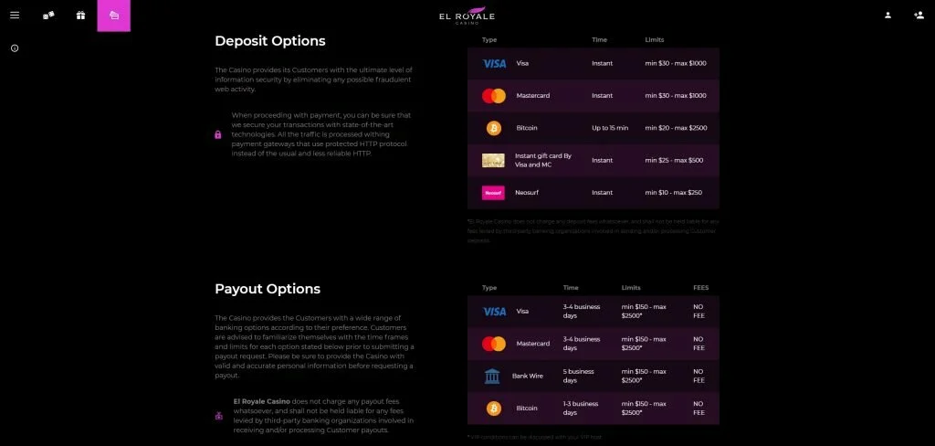 One of the first things we checked out when we did our review of El Royale Casino is the banking methods. We want to know how you can pay, get paid, how long it will take in each case, and if there are any deposit or withdrawal fees.