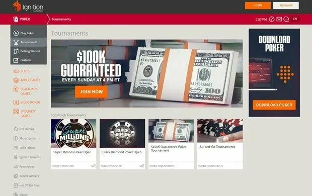 Ignition Poker offers over $2 million a week in tournament prize pools. These tournaments are scheduled throughout the afternoon and evenings.